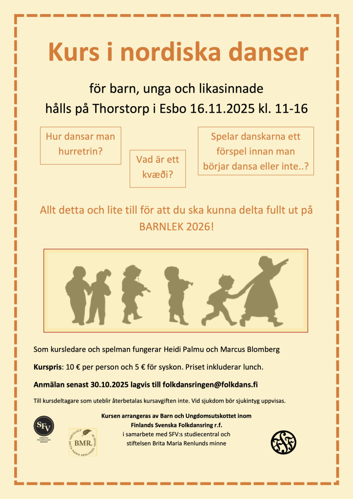 Kursen arrangeras av Barn och Ungdomsutskottet inom Finlands Svenska Folkdansring r.f. i samarbete med SFV:s studiecentral och stiftelsen Brita Maria Renlunds minne.